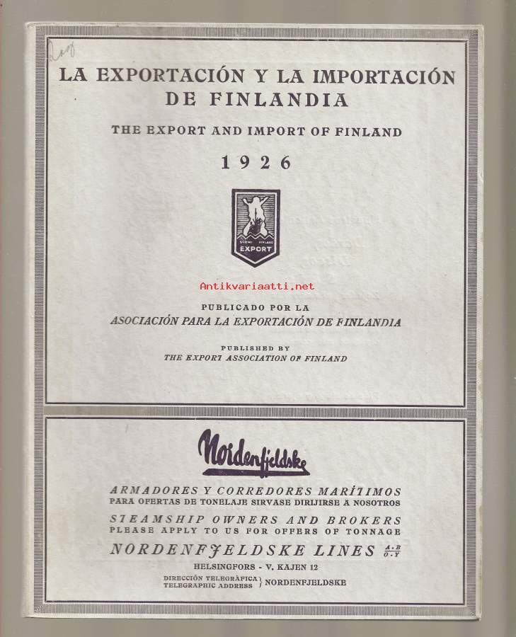 La exportación y la importación de Finlandia : the export and import of FinlandKirjaAsociación para la exportación de Finlandia 1926.Ulkoasu 118 sivua, 2 mellanbl. : kuvitettuKieli ranskaJulkaisija Helsingfors : Asociación para la exportación de Finlandia, 1926.