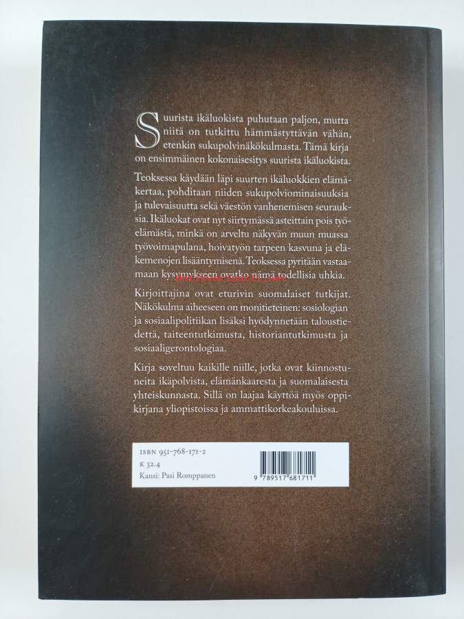 Muu(t) tekijä(t): Matti Virtanen, Pekka Parkkinen ym.Asiasanat: elämäntapa, vanhuus, politiikka, elinolot, työelämä, asuminen, yhteiskunnallinen muutos, identiteetti, elämänkaari, pukeutuminen, ikääntyminen, yhteiskunta, työmarkkinat, poliittinen osallistuminen, nuorisokulttuuri, suuret ikäluokat, sosiologia, elintaso, kulutus, sukupolvet, eläkkeelle siirtyminen, muuttoliike, kuolleisuus, ikäryhmät, sosiaalinen liikkuvuus, sosiaalimenot, väestöryhmät, sosioekonominen asema, syntyvyys, samaistuminen