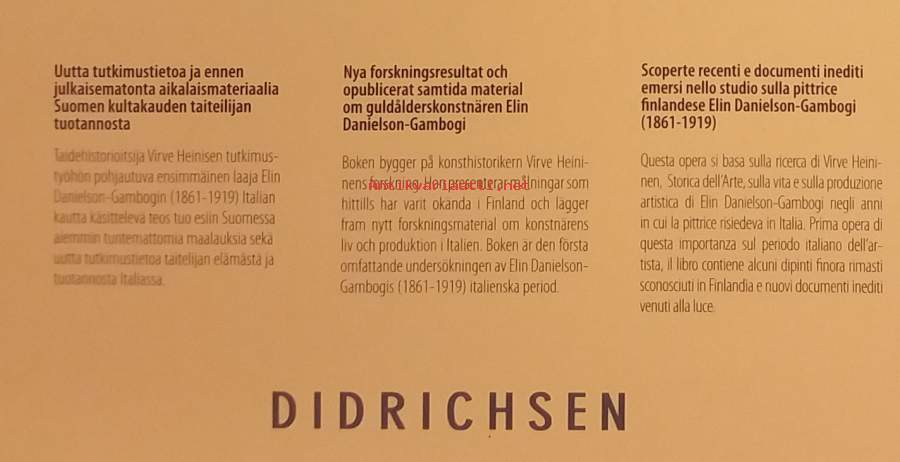 Taidehistorioitsija Virve Heinisen tutkimustyöhön pohjautuva ensimmäinen laaja Elin Danielson-Gambogin (1861-1919) Italian kautta käsittelevä teos tuo esiin Suomessa aiemmin tuntemattomia maalauksia sekä uutta tutkimustietoa taitelijan elämästä ja tuotannosta Italiassa. Kirja sisältää myös artikkelin 1800-luvun lopun ja 1900-luvun alun Italian taiteesta sekä esittelee sanoin ja kuvin yhden maalauksen. Didrichsenin taidemuseon julkaisuja 25. Kuvitettu. Dimensiot 29 ¤ 27 cm.