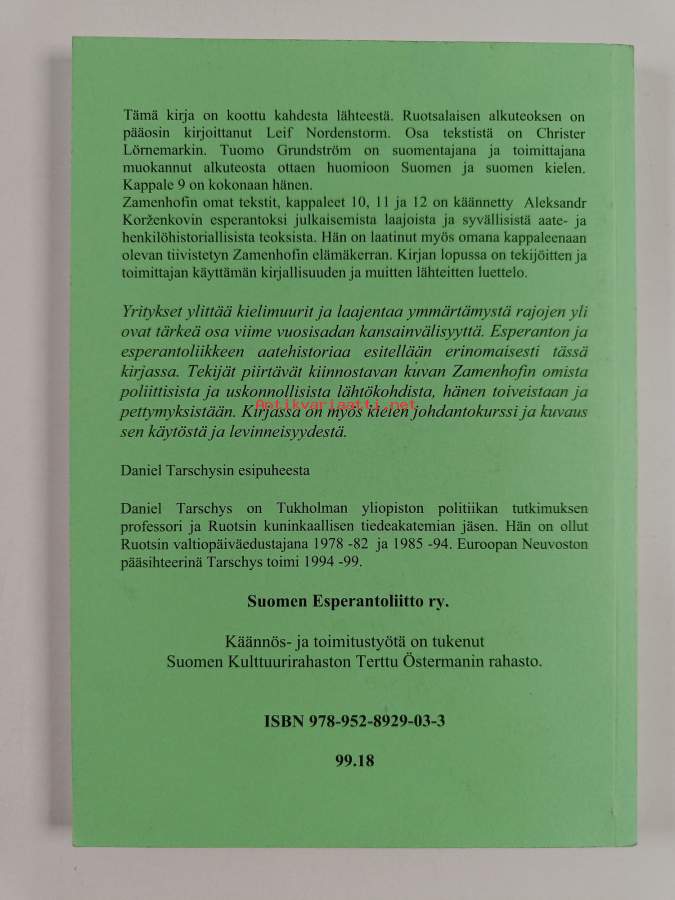 Koko nimi: Tohtori Zamenhof ja kansainvälinen kieli : kirja esperantosta ja ihmisestä sen takana - Yhteiskielen laatijan elämä ja aatteet ; Esperanto kielenä ja kulttuuri-ilmiönäMuu(t) tekijä(t): Leif Nordenstorm, Christer Lörnemark ym.Asiasanat: henkilöhistoria, kielihistoria, kielitieteilijät, esperanto, keinotekoiset kielet, lingua francat