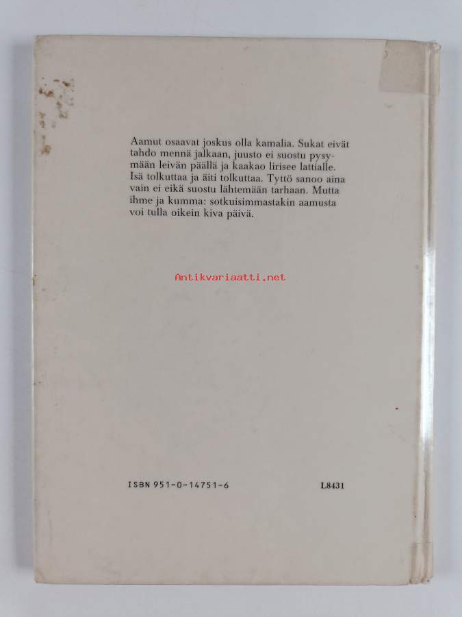 Tyydyttävä. Tarkempi kuntoluokka: K2- ; Pientä kulumaa, hieman nuhruisuutta, hieman tahraisuutta, kirjaston poistokirja, kontaktimuovipäällystys, selkämyksessä hieman vinoutta