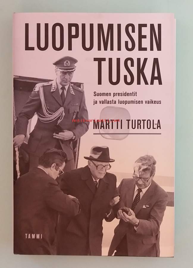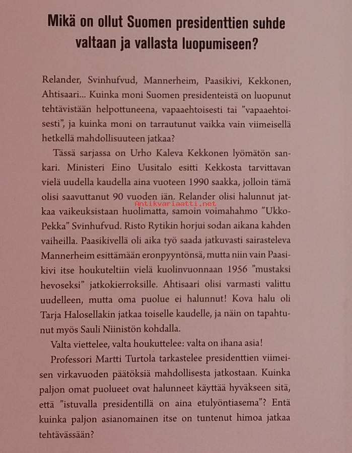 Mikä on ollut Suomen presidenttien suhde valtaan ja vallasta luopumiseen? Professori Martti Turtola tarkastelee presidenttien viimeisen virkavuoden päätöksiä mahdollisesta jatkostaan. Kuinka paljon omat puolueet ovat halunneet käyttää hyväkseen sitä, että "istuvalla presidentillä on aina etulyöntiasema"? Entä kuinka paljon asianomainen itse on tuntenut himoa jatkaa tehtävissään? Kuvitettu. Dimensiot 23 ¤ 16 cm.