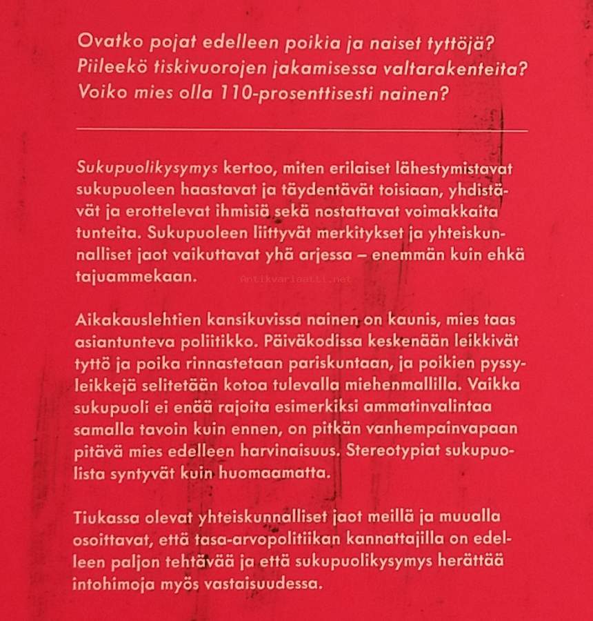 Miten sukupuoleen liittyvät merkitykset ja yhteiskunnalliset jaot vaikuttavat ihmisten elämään? Teos esittelee erilaisia sukupuolen selitysmalleja, kuten käsitystä ihmisen sukupuolesta lajiominaisuutena ja toisaalta ajatusta sukupuolesta sosiaalisesti muotoutuvana. Sukupuolikysymys ei yhteiskunnassamme ole enää vain nais- tai tasa-arvokysymys, vaan siihen kuuluu myös esimerkiksi miehiin kohdistuvien odotusten kriittinen tarkastelu ja heteroseksuaalisuuden itsestäänselvyyden kyseenalaistaminen. Kuvitettu. Dimensiot 23 ¤ 16 cm.