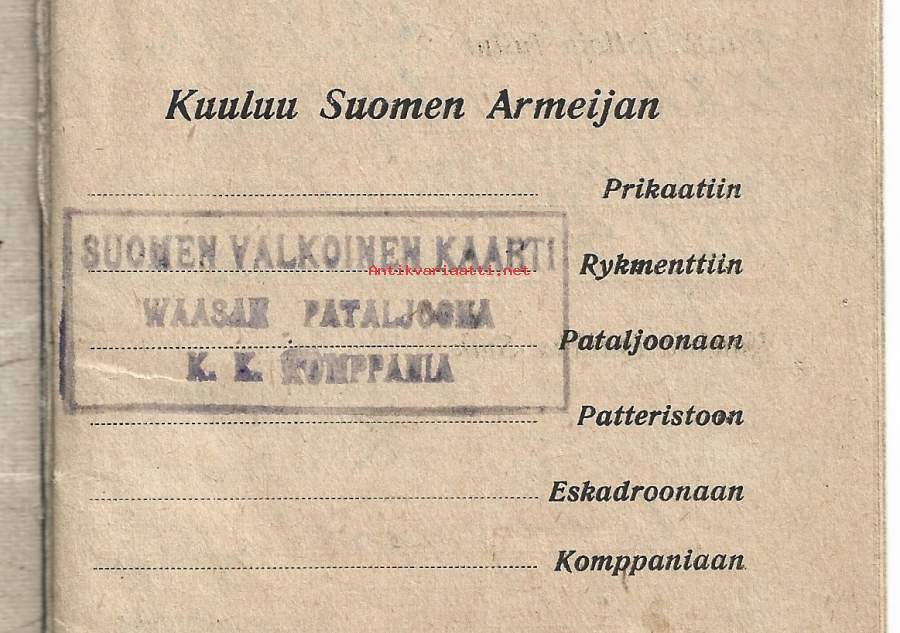 Sotilaskirja - kuuluu Suomen armeijan / Suomen Valkoinen Kaarti , Waasan Pataljoona K. K. Komppania 1921