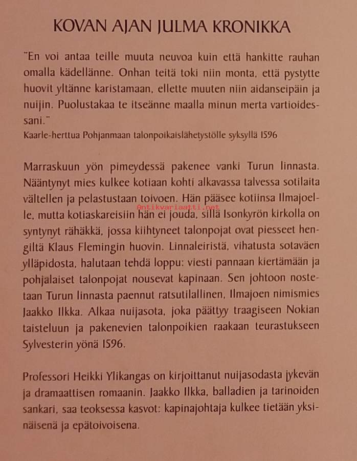 Professori Heikki Ylikangas on kirjoittanut nuijasodasta jykevän ja dramaattisen romaanin. Jaakko Ilkka, balladien ja tarinoiden sankari, saa teoksessa kasvot: kapinajohtaja kulkee tietään yksinäisenä ja epätoivoisena. Dimensiot 20 ¤ 14 cm.