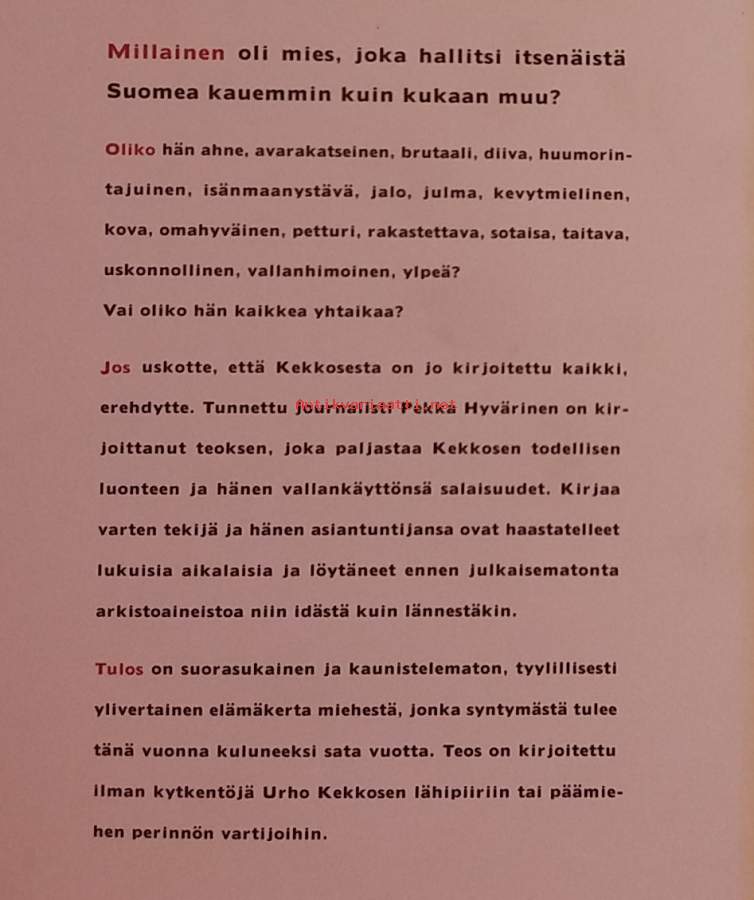 Tunnettu journalisti Pekka Hyvärinen on kirjoittanut teoksen, joka paljastaa Kekkosen todellisen luonteen ja hänen vallankäyttönsä salaisuudet. Tulos on suorasukainen ja kaunistelematon, tyylillisesti ylivertainen elämäkerta miehestä, jonka syntymästä tulee tänä vuonna kuluneeksi sata vuotta. Kuvitettu. Dimensiot 22 ¤ 15 cm.