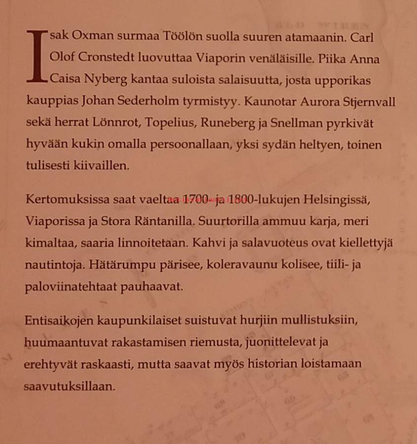 Helsinki-Viaporin kaksoiskaupunki: Pienissä novellimaisissa kertomuksissa historia herää eloon: pääset kurkistamaan satoja vuosia sitten eläneiden ihmisten kommelluksiin ja toinen toistaan ihmeellisempiin kohtaloihin. Salaperäiset ja toisinaan jopa uskomattomilta kuulostavat tarinat perustuvat tositapahtumiin. Kuvitettu. Dimensiot 21 ¤ 16 cm.