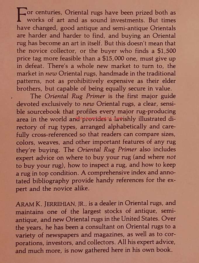 "First major guide devoted exclusively to new Orientals, profiling every major rug-producing area in the world. A lavishly illustrated alphabetical directory rug type is carefully cross-referenced so that you can compare sizes, colors, weaves and other important features of any rug you're buying."Kuvitettu. Dimensiot 25 ¤ 17 cm.