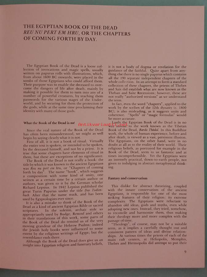 In this book all the vignettes from the Papyri of Ani, Hunefer and Anhai are reproduced, for the first time, in full color photographs. These three papyri rank among the most superb specimens of a collection of Egyptian funerary texts which, for the past 130 years, has been known by the title Book of the Dead. The Papyrus of Ani, at slightly more than 78 feet, is the longest papyrus of the Book of the Dead from the Theban period; the Papyrus of Hunefer measures 18 feet 1 inch, and that of Anhai 14 feet 6 inches. Kuvitettu. Dimensiot 28 ¤ 22 cm.