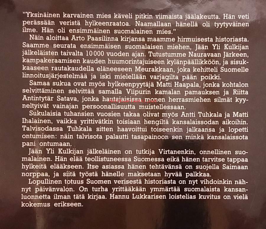 Kuvitus Hannu Lukkarinen. Teoksessa saamme seurata ensimmäisen suomalaisen miehen, Jään Yli Kulkijan jälkeläisten taivalta 10000 vuoden ajan. Dimensiot 30 ¤ 22 cm.
