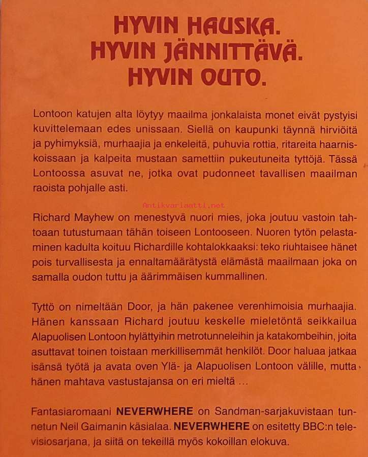 Fantasiaromaani vie sinut Lontoon katujen alle, josta löytyy maailma, jota et edes pysty kuvittelemaan. Siellä on kaupunki täynnä hirviöitä ja pyhimyksiä, murhaajia ja enkeleitä, puhuvia rottia, ritareita. Siellä asuvat ne, jotka ovat pudonneet tavallisen maailman raoista pohjalle asti. Dimensiot 19 ¤ 12 cm.