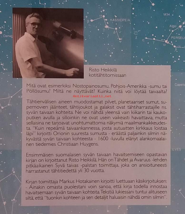Tähtienvälisen aineen muodostamat pilvet, planetaariset sumut, supernovien jäänteet, tähtijoukot ja galaksit ovat tähtiharrastajille ns. syvän taivaan kohteita. Ensimmäisen suomalaisen syvän taivaan havaitsemiseen opastavan kirjan kirjoittaja Risto Heikkilä on Tähdet ja Avaruus -lehden pitkäaikainen Syvä taivas -palstan toimittaja, joka on harrastanut tähtitiedettä yli kolme vuosikymmentä. Kuvitettu. Dimensiot 24 ¤ 18 cm.