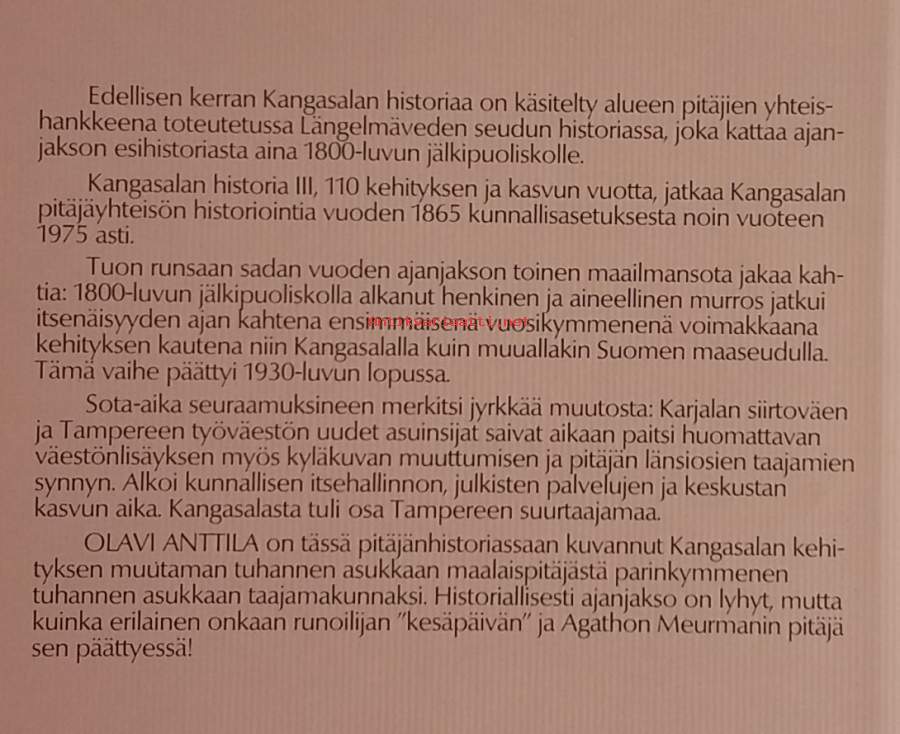 Kirjoittaja on kuvannut Kangasalan kehityksen muutaman tuhannen asukkaan maalaispitäjästä parinkymmenentuhannen asukkaan taajamakunnaksi. Kuvitettu. Dimensiot 26 ¤ 19 cm