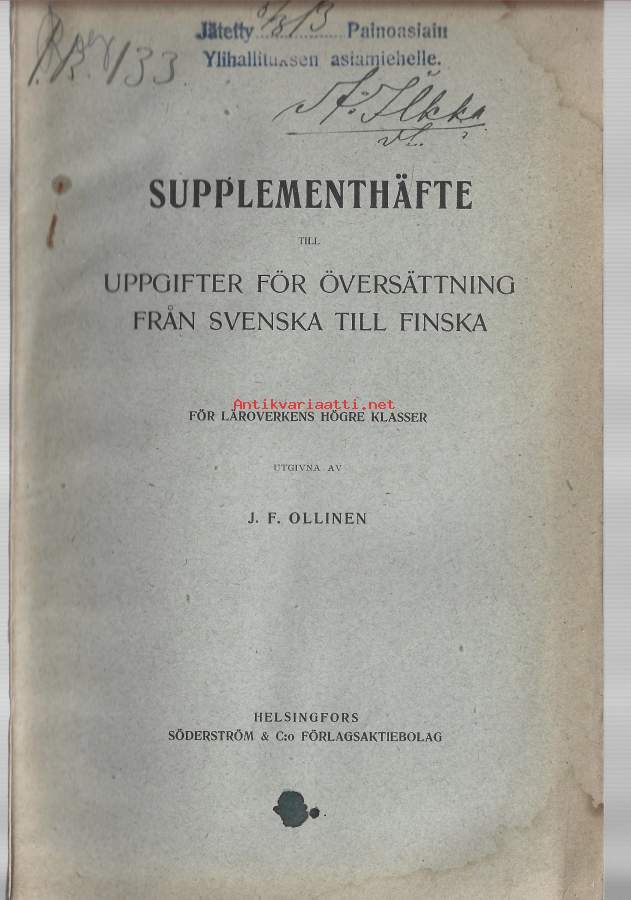 Supplementhäfte till Uppgifter för översättning från svenska till finska : för läroverkens högre klasserKirjaOllinen, J. F. ; Söderström & C:o , kustantajaSöderström 1913.Ulkoasu [4], 86 sivuaKieli suomiruotsiJulkaisija Helsingfors : Söderström, 1913.Lisätiedot J. F. Ollinen