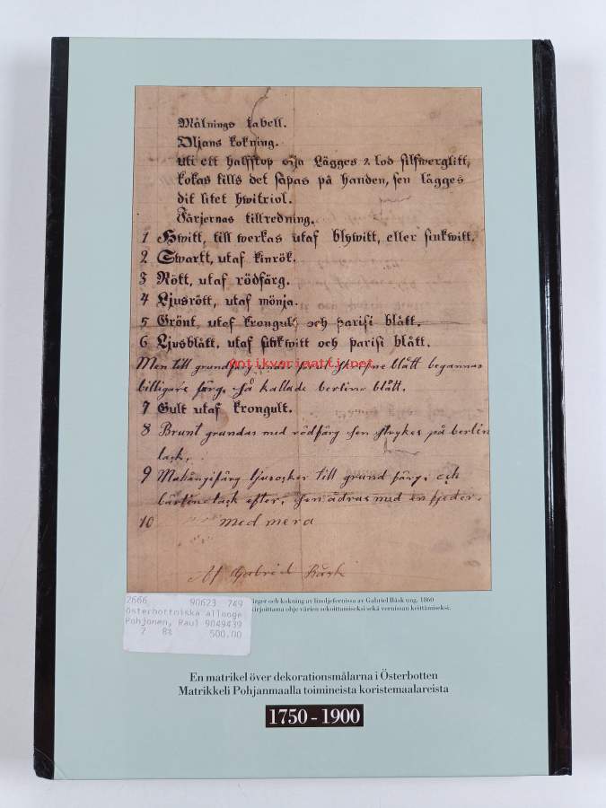 Koko nimi: De österbottniska allmogemålarna 1750-1900 : en matrikel över dekorationsmålarna i Österbotten = Pohjanmaan talonpoikaismaalarit 1750-1900 : matrikkeli Pohjanmaalla toimineista koristemaalareistaMerkinnät: omistajamerkintä (leima)Asiasanat: historia, huonekalut, koristemaalaus, kansanomaiset huonekalut, talonpoikaistyyli, kansantaiteilijat, maalarit