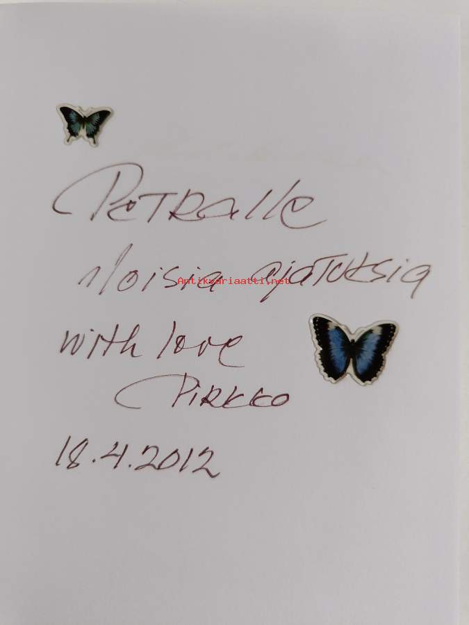 Erinomainen. Tekijän signeeraama, omistajakirjoituksen viereen liimattu muutama tarra