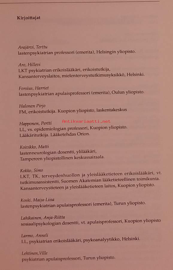 Terttu Marjatta Arajärvi oli suomalainen lastentautien erikoislääkäri, professori, lastenpsykiatrian kehittäjä ja Suomen tunnetuimpia lastenpsykiatreja. Hänen teoksensa pyrkii ymmärtämään, tunnistamaan ja hoitamaan lasten ja nuorten psyykkisiä ongelmia. Se sisältää epidemiologisia, interventio- ja kulttuuripsykiatrisia tutkimuksia. Tavoitteena on edistää varhaista tunnistusta, ehkäisyä ja hoitoa, sekä kehittää uusia työkaluja ja palveluita. Dimensiot 25 ¤ 17 cm.