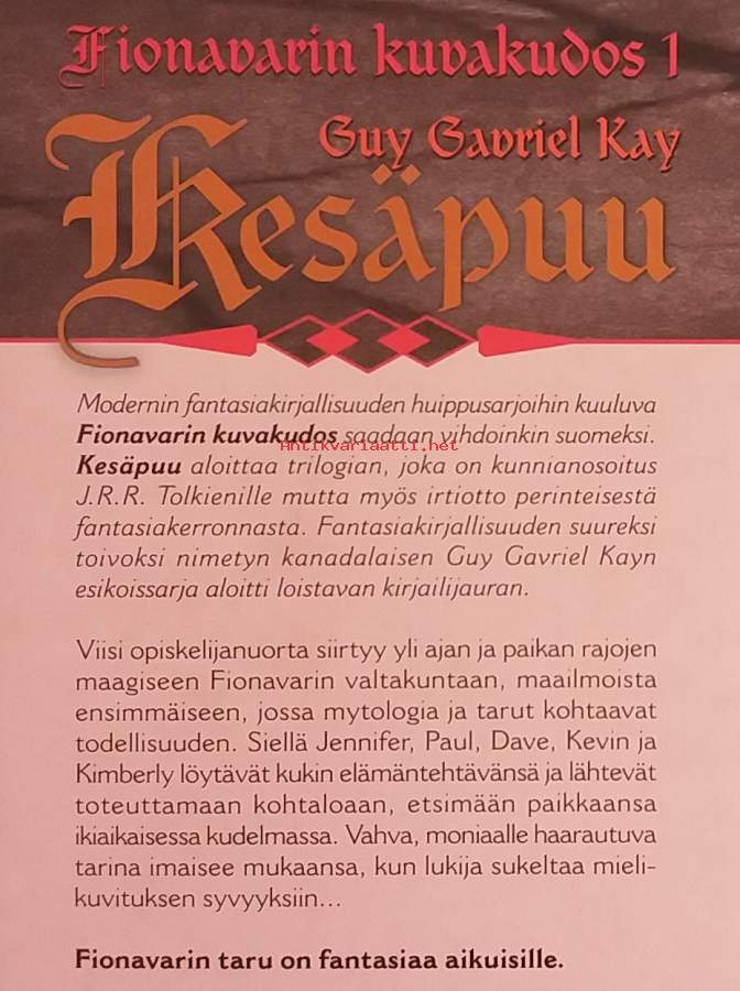 Modernin fantasiakirjallisuuden huippusarjoihin kuuluva Fionavarin kuvakudos saadaan vihdoinkin suomeksi. Viisi opiskelijanuorta siirtyy yli ajan ja paikan rajojen maagiseen Fionavarin valtakuntaan, maailmoista ensimmäiseen, jossa mytologia ja tarut kohtaavat todellisuuden. Siellä Jennifer, Paul, Dave, Kevin ja Kimberly löytävät kukin elämäntehtävänsä ja lähtevät toteuttamaan kohtaloaan, etsimään paikkaansa ikiaikaisessa kudelmassa. Vahva, moniaalle haarautuva tarina imaisee mukaansa, kun lukija sukeltaa mielikuvituksen syvyyksiin. Dimensiot 21 ¤ n 15 cm.