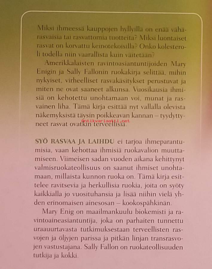 Pudota painoasi ja tunne olosi hyväksi kolmen tieteellisesti suunnitellun ruokaohjelman avulla. Miksi ihmeessä kauppojen hyllyillä on enää vähärasvaisia tai . rasvattomia tuotteita? Miksi luontaiset rasvat on korvattu keinotekoisilla? Onko kolesteroli todella niin vaarallista kuin väitetään? Amerikkalaisten ravintoasiantuntijoiden Mary Enigin ja Sally Fallonin ruokakirja selittää, mihin nykyiset, virheelliset rasvakäsitykset perustuvat ja miten ne ovat saaneet alkunsa. Vuosikausia ihmisiä on kehotettu unohtamaan voi, munat ja rasvainen liha. Tämä kirja esittää nyt vallalla olevista näkemyksistä täysin poikkeavan kannan tyydyttyneet rasvat ovatkin terveellisiä. Syö rasvaa ja laihdu ei tarjoa ihmeparantumisia, vaan kehottaa ihmisiä ruokavalion muuttamiseen. Viimeisen sadan vuoden aikana kehittynyt valmisruokateollisuus on saanut ihmiset unohtamaan, millaista kunnon ruoka on. Tämä kirja esittelee ravitsevia ja herkullisia ruokia, joita on syöty kaikkialla jo vuosituhansia ja lisää niihin vielä yhden erinomaisen ainesosan kookospähkinän.