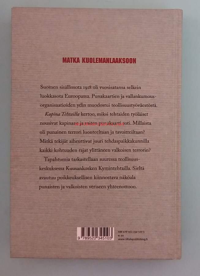 Kesällä 1918 Kuusankoskea kutsuttiin "Kuolemanlaaksoksi", sillä alueella teloitettiin 280 punaista miestä ja naista kuukauden aikana. Teos pureutuu syihin, miksi kapinaan noustiin, millainen oli punaisen vallan ja terrorin luonne, ja miten punakaarti kävi sotaansa. Lisäksi teos selvittää, mikä aiheutti valkoisen terrorin, joka ylitti kohtuuden rajat. Kuvitettu. Dimensiot 21 ¤ 15 cm.