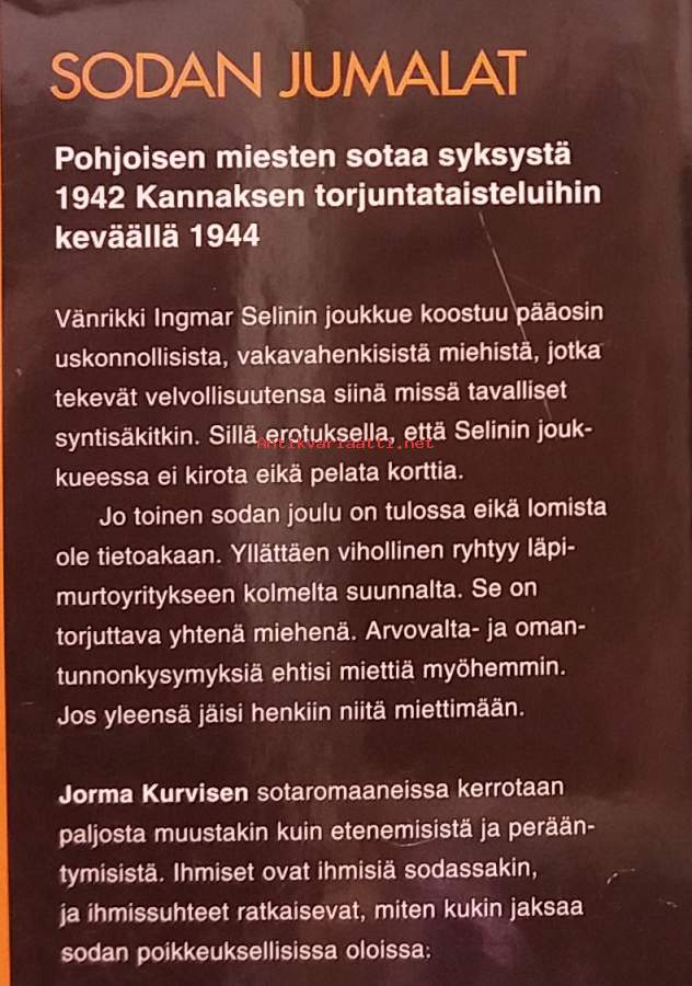 Pohjoisen miesten sotaa syksystä 1942 Kannaksen torjuntataisteluihin keväällä 1944.Vänrikki Ingmar Selinin joukkue koostuu pääosin uskonnollisista, vakavahenkisistä miehistä, joka tekevät velvollisuutensa siinä missä tavalliset syntisäkitkin. Dimensiot 20 ¤ 15 cm.