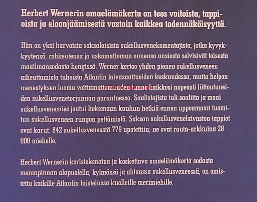 Tämä on kertomus voitoista, tappioista ja eloonjäämisestä vastoin kaikkea todennäköisyyttä. Herbert Werner on eräs harvoista saksalaisista sukellusvenekomentajista, jotka kykyjensä, rohkeutensa ja uskomattoman onnensa ansiosta selvisivät hengissä toisesta maailmansodasta. Werner kertoo yhden sukellusveneen aiheuttamista tuhoista Atlantin laivasaattueille...... Kuvitettu. Dimensiot 21 ¤ 15 cm.