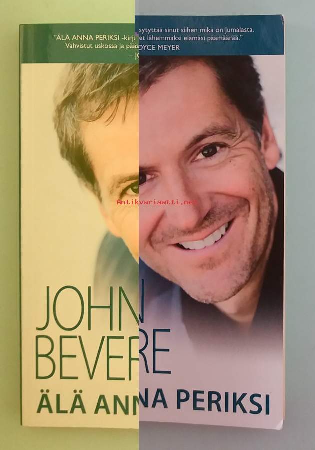 JOHN BEVERE on julistava kirjailija, jonka koko palveluelämä on keskittynyt tukemaan kanssakristittyjä, jotka kamppailevat vaikeuksien taisteluissa. Raamatun ihmiskohtaloista löytyvät ajattomat, koetellut ja kestävät elämänohjeet kaikille. Jumala on kaikkien ihmisten Vapahtaja ja Jumalan sana auttaa kaikkia ihmisiä.”Älä anna periksi on ehdoton kirjavalinta vastoinkäymisten kompastuskiviin törmänneille. Jumala käyttää elämän laaksoja ja myrskyjä varustaakseen meitä saavuttamaan suunnitelmansa lopullisuuden. John Bevere muistuttaa meitä siitä, ettei Jumala koskaan menetä toivoaan suhteemme, eikä meidän koskaan pitäisi menettää toivoamme Jumalan suhteen.” Dimensiot 23 ¤ 15 cm.