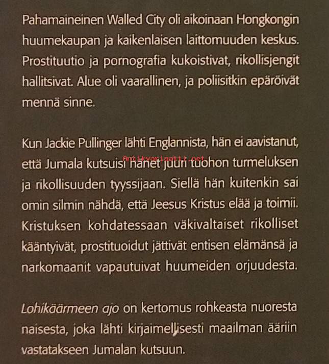 Lohikäärmeen ajo perustuu hyvin erikoisiin ja puhutteleviin todellisiin tapahtumiin. Nuori englantilainen tyttö sai sydämelleen kutsun lähetystyöhön, kolkutteli turhaan monien lähetysjärjestöjen ovia ja lähti viimein omin päin maailmalle päätyen Hongkongin huonomaineisimpaan osaan Walled Cityyn. Siellä hän aloitti lähetystyönsä prostituution, peliluolien, rokollisliigojen ja kaikenlaisen saastan keskellä. ”Lohikäärmeen ajo” on vavahduttava ja myös vaikuttava lukukokemus. Se on väkevä todistus evankeliumin voimasta ja siitä, mitä voi tapahtua, kun joku antautuu kokonaan Jeesuksen käyttöön. Dimensiot 21 ¤ 14 cm.