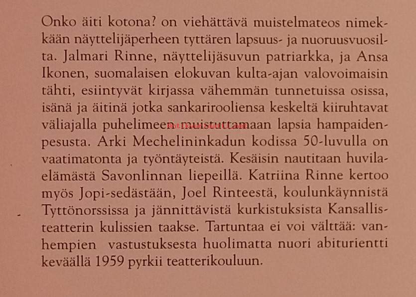 Kirja on viehättävä muistelmateos nimekkään näyttelijäperheen lapsuus- ja nuoruusvuosilta. Jalmari Rinne, näyttelijäsuvun patriarkka, ja Ansa Ikonen, suomalaisen elokuvan kulta-ajan valovoimaisin tähti, esiintyvät kirjassa vähemmän tunnetuissa osissa, isänä ja äitinä, Kuvitettu. Dimensiot 21 ¤ 14 cm.