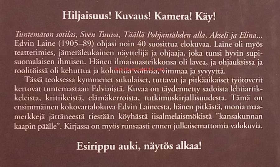 Tuntematon sotilas, Sven Tuuva, Täällä Pohjantähden alla, Akseli ja Elina... Edvin Laine (1905-89) ohjasi noin 40 suosittua elokuvaa. Laine oli myös teatterimies, jämeräleukainen näyttelijä ja ohjaaja, joka tunsi hyvin supisuomalaisen ihmisen. Tämä kirja laventaa ja syventää kuvaa: hänen ilmaisuasteikkonsa oli lavea ja ohjauksissa ja roolitöissä oli kehuttua ja kohuttua voimaa, vimmaa ja syvyyttä. Kuvitettu. Dimensiot 22 ¤ 15 cm.