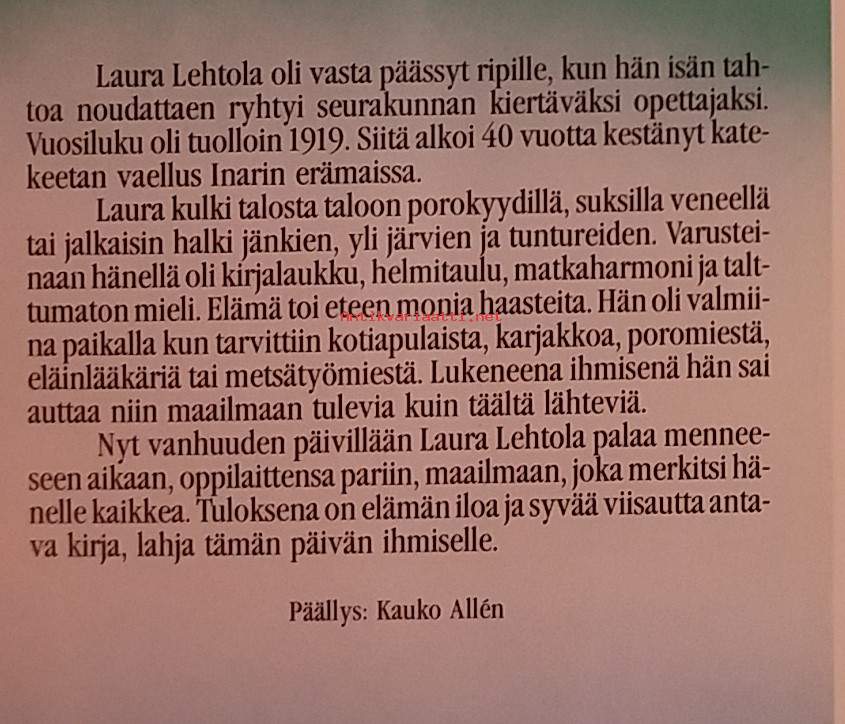 Kun Laura ryhtyi kiertäväksi opettajaksi oli vuosiluku 1919. Siitä alkoi 40 vuotta kestänyt katekeetan vaellus Inarin erämaissa talosta taloon porokyydillä, suksilla, veneellä tai jalkaisin halki jänkien, yli järvien ja tuntureiden. Kuvitettu. Dimensiot 20 ¤ 14 cm.