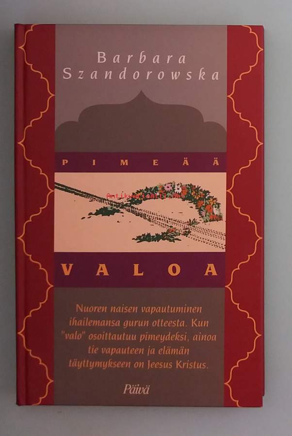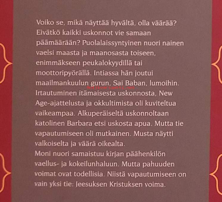 Kirja kuvaa nuoren naisen vapautumista ihailemansa gurun otteesta, valon osoittautuessa pimeydeksi. Barbara joutui Intian matkallaan maailmankuulun gurun Sai Baban lumoihin. Irtautuminen itämaisesta uskonnosta, New Age-ajattelusta ja okkultismista oli kuviteltua vaikeampaa. Dimensiot 21 ¤ 14 cm.