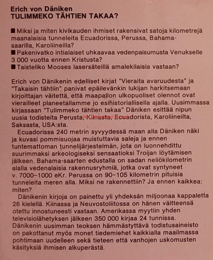 Teoksessaan Däniken esittää uusia todisteita Perusta, Kiinasta, Ecuadorista, Karoliineilta, Saksasta ja USA:sta, niin tulimmeko siis tähtien takaa. Kuvitettu. Dimensiot 20 ¤ 12 cm.