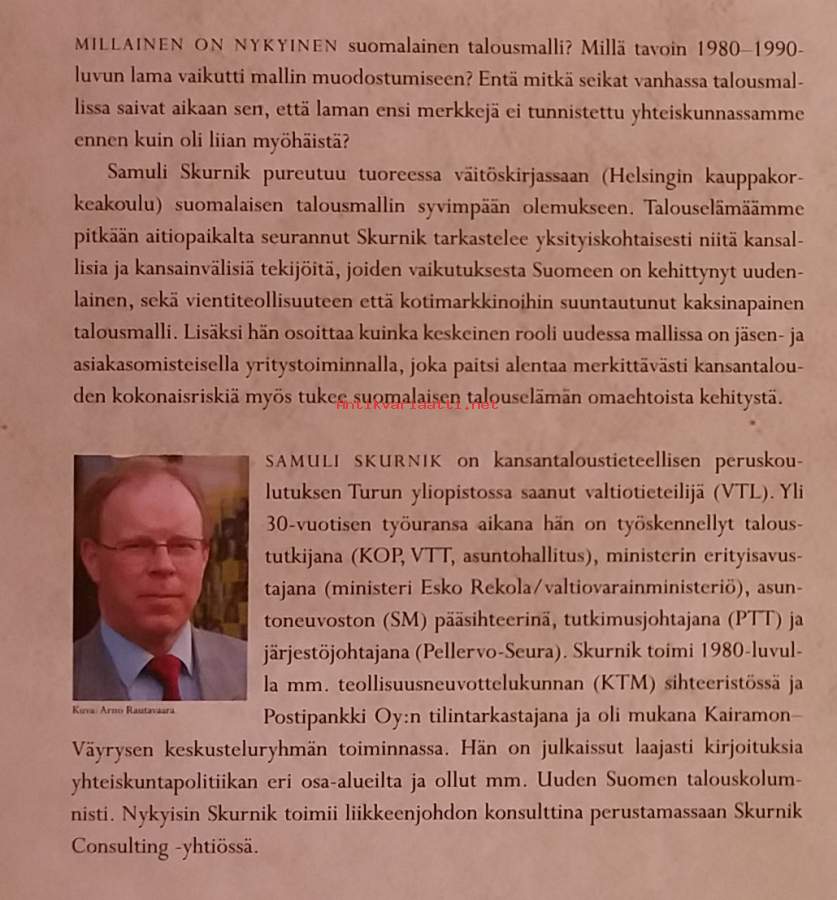 Samuli Skurnik paneutuu tuoreessa väitöskirjassaan suomalaisentalousmallin syvimpään olemukseen. Talouselämäämme pitkään aitiopaikalta seurannut Skurnik tarkastelee yksityiskohtaisesti niitä kansallisia ja kansainvälisiä tekijöitä, joiden vaikutuksesta Suomeen on kehittynyt uudenlainen, sekä vientiteollisuuteen että kotimarkkinoihin suuntautunut kaksinapainen talousmalli. Dimensiot 25 ¤ 18 cm.