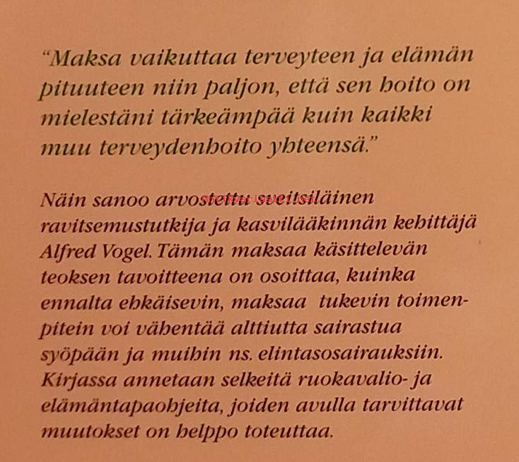 A.Vogel käsittelee tässä teoksessaan maksan ja ruoansulatuselimistön hoitoa ja merkitystä sairauksien ehkäisyssä. Kirjassa on runsaasti ruokaohjeita. "Maksa ja terveys" käsittelee maksan toimintaa ja sen merkitystä kokonaisvaltaiselle hyvinvoinnille, painottaen kasviperäisten hoitojen ja ruokavalion roolia. Dimensiot 21 ¤ 15 cm.
