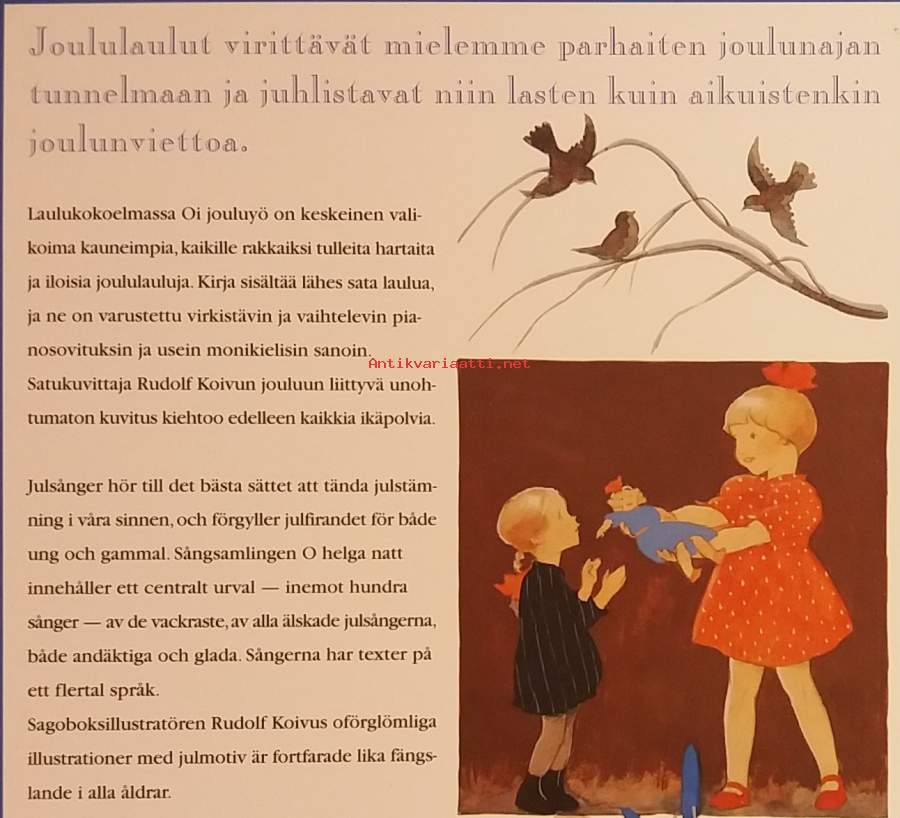 Joulumusiikin ja nuottien ystäville tarkoitettu musiikkiteos on keskeinen valikoima kauneimpia, kaikille rakkaiksi tulleita hartaita ja iloisia joululauluja. Kirja sisältää lähes sata laulua. Kuvitettu ( Rudolf Koivu ). Dimensiot 30 ¤ 23 cm.