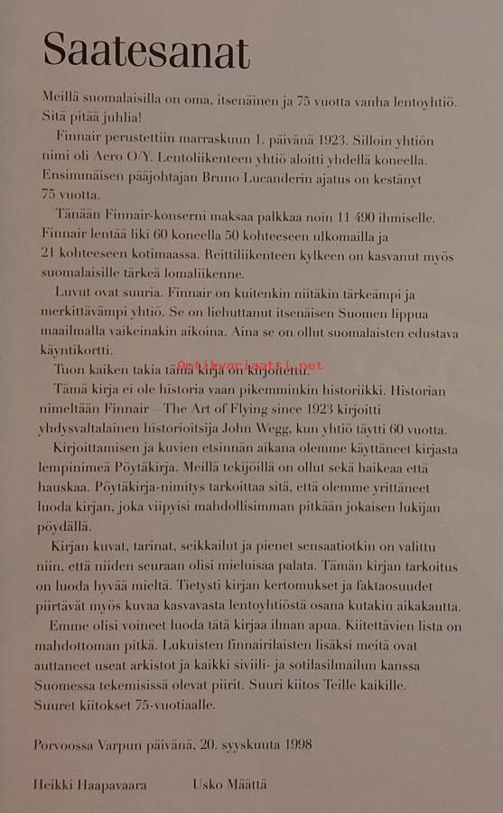 Kirjan kertomukset ja tieto-osuudet piirtävät kuvan kasvavasta lentoyhtiöstä ja sen työntekijöistä osana kutakin aikakautta. Kuvitettu. Dimensiot 30 ¤ 23 cm.