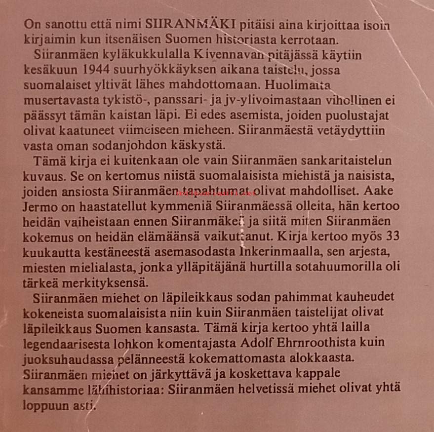 Siiranmäen taistelu oli puolustustaistelu entisessä Kivennavan kunnassa Karjalankannaksella jatkosodassa. Se liittyy Neuvostoliiton suurhyökkäykseen 1944. Siiranmäen puolustuksesta vastasi everstiluutnantti Adolf Ehrnroothin johtama jalkaväkirykmentti 7, joka kuului kenraalimajuri A. E. Martolan komentamaan 2. divisioonaan. Kuvitettu. Dimensiot