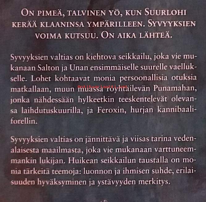 Syvyyksien valtias on kiehtova seikkailu, joka vie mukanaan Salton ja Unan ensimmäiselle suurelle vaellukselle. Vaellus on täynnä vaaroja, mutta matkaan mahtuu myös paljon huumoria ja iloa. Taustalla on tärkeä sanoma ihmisen ja luonnon yhteenkuuluvuudesta. Jännittävä ja viisas tarina vie mukanaan varttuneemmankin lukijan. Dimensiot 18 ¤ 12 cm.