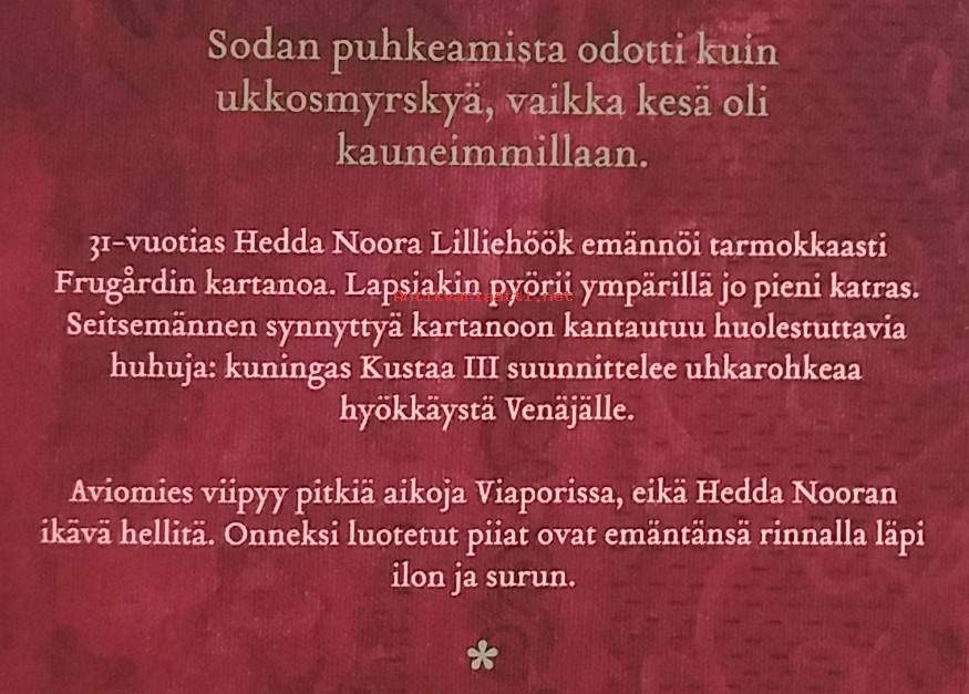 Huippusuositun Enni Mustosen uutuussarjan toinen osa kuvaa nuoren kartanonemännän elämää 1700-luvun lopun Suomessa. Hedvig Eleonora Lilliehöökin tyttövuodet ovat jääneet taakse, ja hän emännöi tarmokkaasti Frugårdin kartanoa. Lapsiakin on siunaantunut jo pieni katras. Dimensiot 21 ¤ 15 cm.