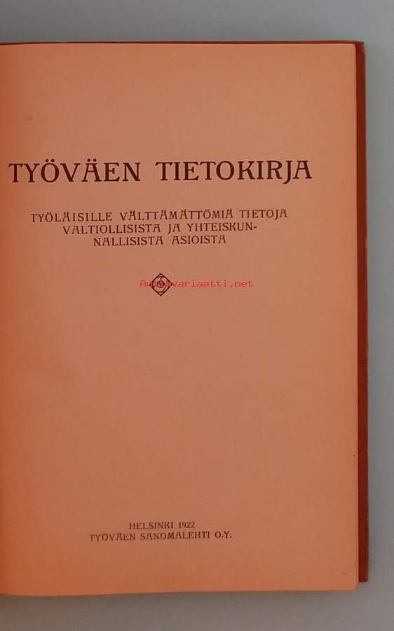 Teos sisältää välttämättömiä tietoja valtiollisista ja yhteiskunnallisista asioista työväen omaksuttavaksi. Suomalainen yhteiskunnallisia aiheita käsittelevä hakuteos, jonka toimittivat sosiaalidemokraattista työväenliikettä edustaneet henkilöt. Sen oli tarkoitus tarjota julkisessa elämässä käsitellyistä yhteiskunnallisista ja poliittisista aiheista helppokäyttöistä sekä työläisten tarpeita ja ”työväen ajatustapaa” vastaavaa tietoa, jota muu tietokirjallisuus ja koululaitos eivät tarjonneet. Dimensiot 21 ¤ 14 cm.