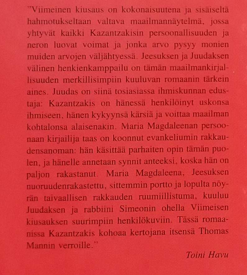 Jeesuksen ja Juudaksen välinen henkienkamppailu on tämän maailmankirjallisuuden merkillisimpiin kuuluvan romaanin tärkein aines, jonka on kirjoittanut kansainvälisen rauhanpalkinnon saanut Niko Kazatzakis. Dimensiot 21 ¤ 13 cm.