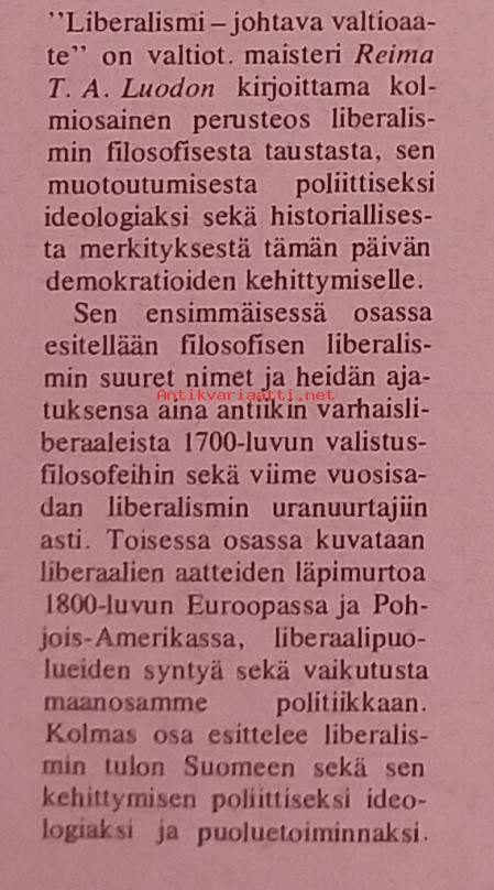 Perusteos liberalismin filosofisesta taustasta, sen muotoutumisesta poliittiseksi ideologiaksi sekä sen merkityksestä tämän päivän demokratioille. Dimensiot 22 ¤ 16 cm.