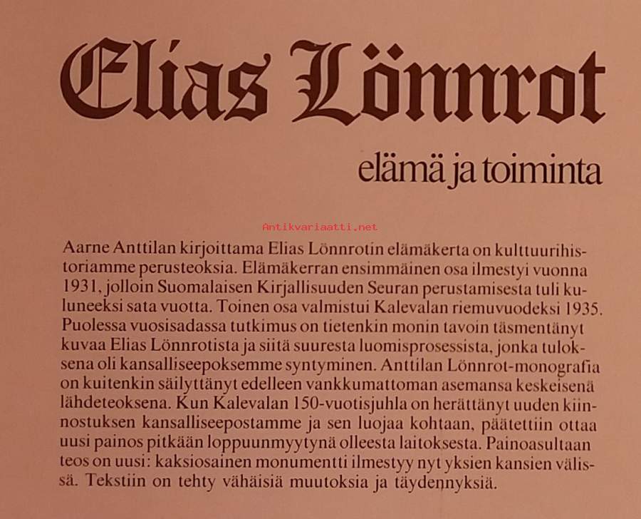 Kirja Elias Lönnrotin elämäkerrasta. Kalevalan 150-vuotisjuhla aktualisoi jälleen kerran Lönnrotin elämän ja toiminnan. Teoksen lopussa on kirjallisuusluettelo myös uudemman Lönnrot-tutkimuksen tuloksista. Elias Lönnrot oli merkittävä suomalainen kansanrunouden tutkija, lääkäri, kielimies ja kansanvalistaja. Dimensiot 23 ¤ 18 cm.