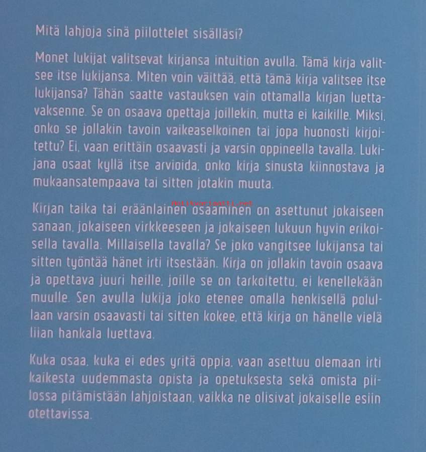 Kuka osaa, kuka ei edes yritä oppia, vaan asettuu olemaan irti kaikesta uudemmasta opista ja opetuksesta sekä omista piilossa pitämistään lahjoistaan, vaikka ne olisivat jokaiselle esiin otettavissa. Dimensiot 23 ¤ 15 cm.