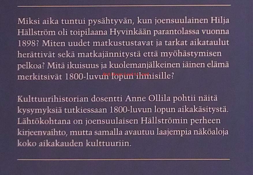 Mikrohistoriallinen tutkimus suomalaisen sivistyneistön aikakäsityksistä 1800-luvun lopulla. Miten erilaiset aikatasot ja käsitykset ajasta jäsensivät ihmisten elämää? Onko aika kulttuurisidonnainen asia, joka opitaan ja omaksutaan vähitellen kuten muutkin kulttuuriin sisältyvät säännöt, tavat ja uskomukset? Tutkimuksen kohteena on erityisesti joensuulaisen piirilääkäri Hällströmin perhe. Perheen neljä tytärtä toimivat kukin opettajina, eivätkä avioituneet.1800-luvun loppu on tutkimuksen kannalta erityisen kiinnostava jakso; modernisoituminen vaikutti myös pikkukaupungin ihmisten elämässä. Kuvitettu. Dimensiot 21 ¤ 15 cm.