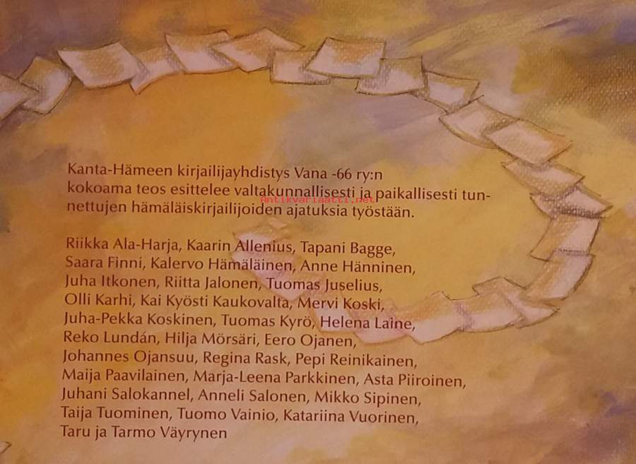 Värikäs, moniääninen näkymä kirjailijuuteen ja kirjoittamiseen, kertoo kirjailijoiden suhteesta mm. kustantajaan, kritiikkiin, julkisuuteen ja kirjoittajayhteisöihin , kertojina 32 nykykirjailijaa, jotka asuvat tai ovat asuneet Kanta-Hämeessä. Kuvitettu. Dimensiot 22 ¤ 30 cm.