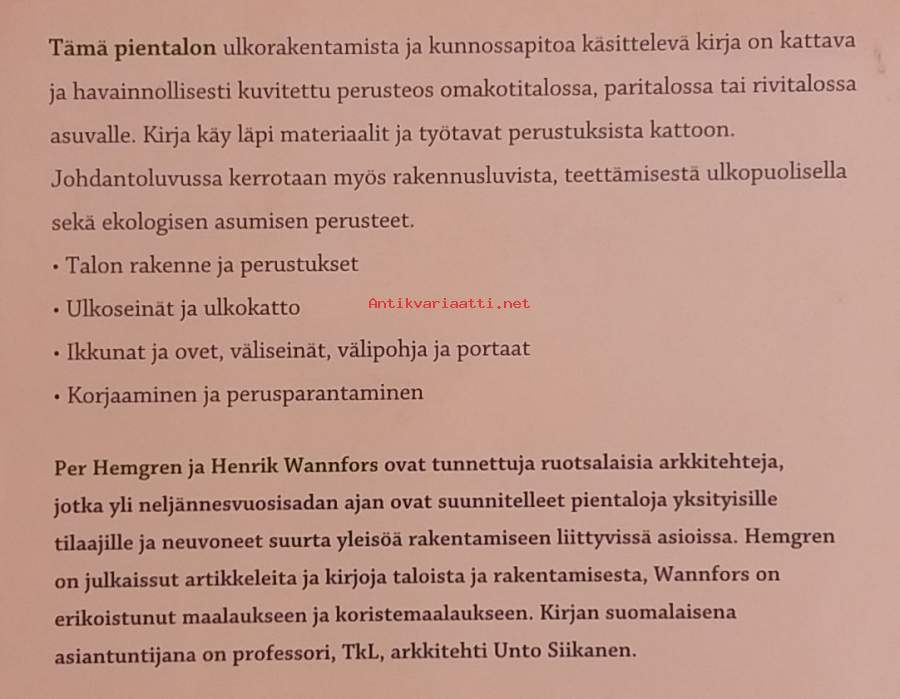 Kuvitettu. Dimensiot 27 ¤ 20 Cm. Kirja käsittelee pientalon ulkorakentamista ja sisältää tietoa mm. perustuksista, seinistä, katoista, ikkunoista, ovista, portaista sekä korjaamisesta ja perusparantamisesta.