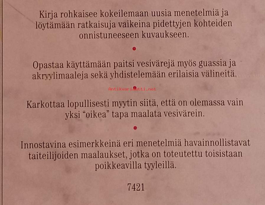 Opas vesivärien, guassin ja akryylimaalien käyttöön. Kirja rohkaisee kokeilemaan uusia menetelmiä ja löytämään ratkaisuja vaikeina pidettyjen kohteiden onnistuneeseen kuvaukseen. Innostavina esimerkkeinä eri menetelmiä havainnollistavat taiteilijoiden maalaukset, jotka on toteutettu toisistaan poikkeavilla tyyleillä. Kuvitettu. Dimensiot 23 ¤ 23 cm.