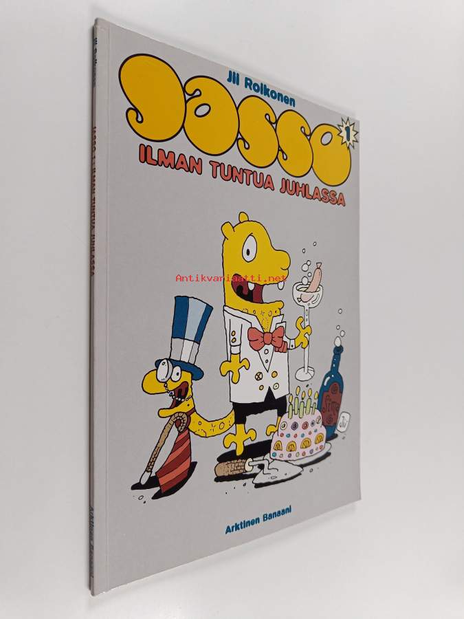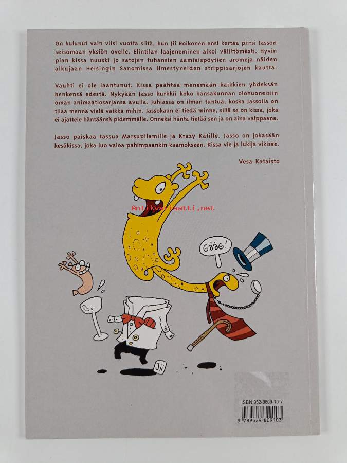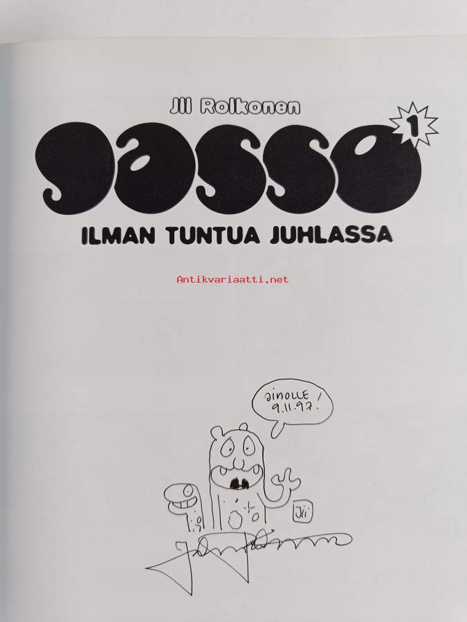 Hyvä. Tarkempi kuntoluokka: K3+ ; Pienoista kolhua selkämyksen yläosassa, pienoista kulumaa, takana hintalapun jäämää. tekijän signeeraama omiste jonka ohessa piirros Jassosta